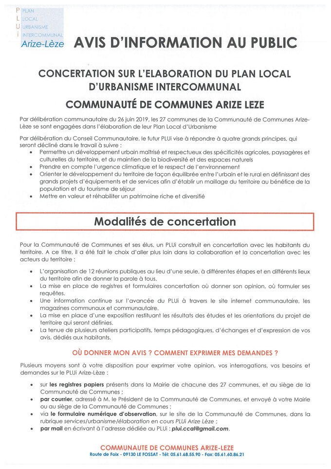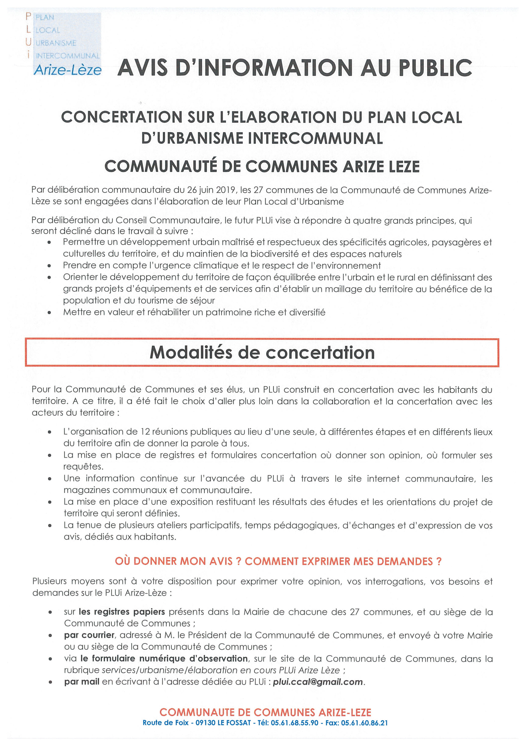 vousetesici Accueil UrbanismeProcédure d’élaboration du PLUI ARIZE LEZE AVIS CONCERTATION PUBLIQUE
