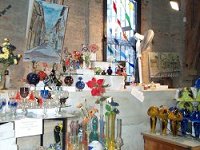 Là, dans une féérie de couleur vous trouverez son atelier et une exposition d’objets mis à la vente pour votre plus grand plaisir : lampe, flacons et verreries...