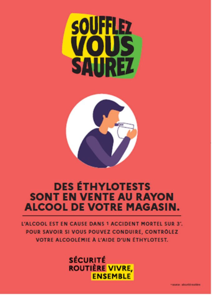 Les mentions inscrites en caractère noir sur cette affiche sont : en haut d'affiche est écrit : "Soufflez vous saurez" sur un fond orange et vert. Au milieu de l'affiche est écrit : "Des éthylotests sont en vente dans votre magasin. En-dessous en caractère plus petit, noir, est écrit : "L'alcool est en cause dans un accident mortel sur 3. Pour savoir si vous pouvez conduire, contrôlez votre alcoolémie à l'aide d'un éthylotest." Tout en bas de l'affiche est écrit (en noir, en majuscule sur fond rouge et jaune) : "Sécurité routière, vivre ensemble".