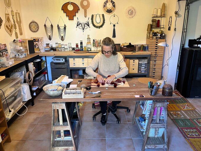 Artisanat fait main : création de décorations murales (bijoux muraux) brodées main dans mon atelier.